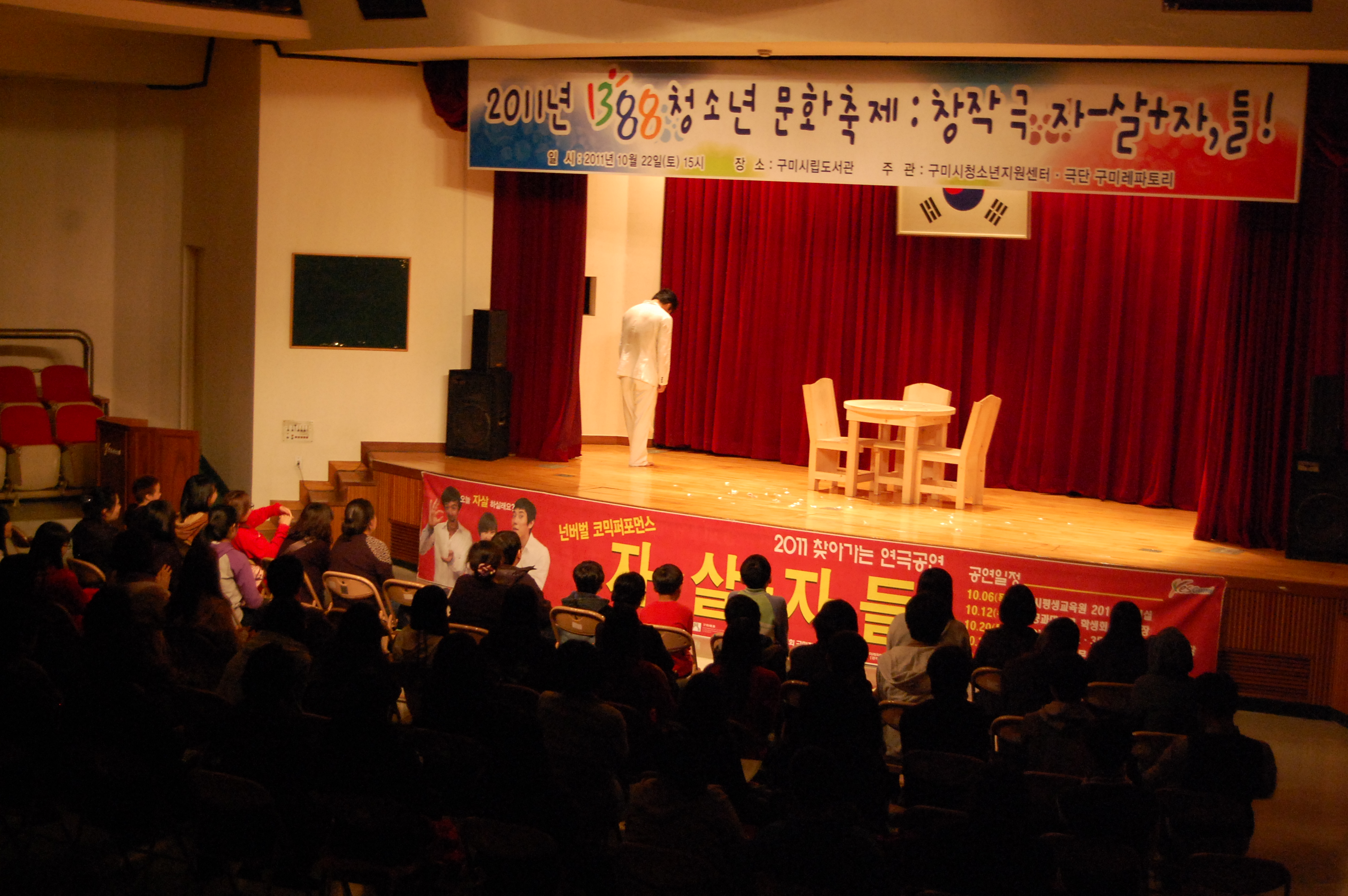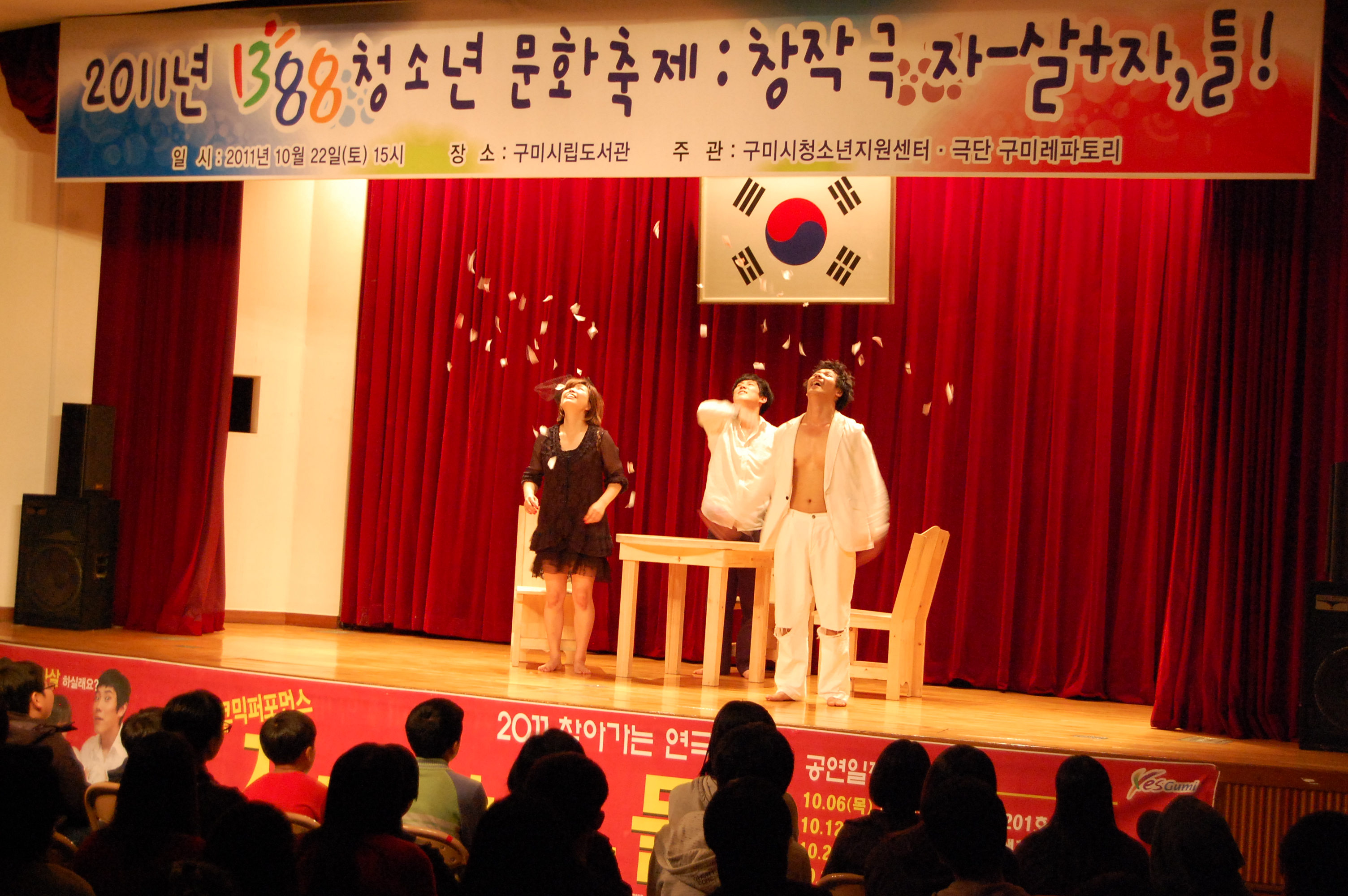 ±¸¹Ì½Ãû¼Ò³âÁö¿ø¼¾ÅÍ(¼ÒÀå Àü¿µ¿í)¿¡¼´Â ¡º1388 û¼Ò³â ¹®ÈÃàÁ¦¡»¹«·á ¿¬±Ø°ø¿¬À» 2011³â 10¿ù 22ÀÏ(Åä) 15½Ã¿¡ ±¸¹Ì½Ã¸³µµ¼°ü(Çü°îµ¿) °´ç¿¡¼ ±¸¹Ì½Ã