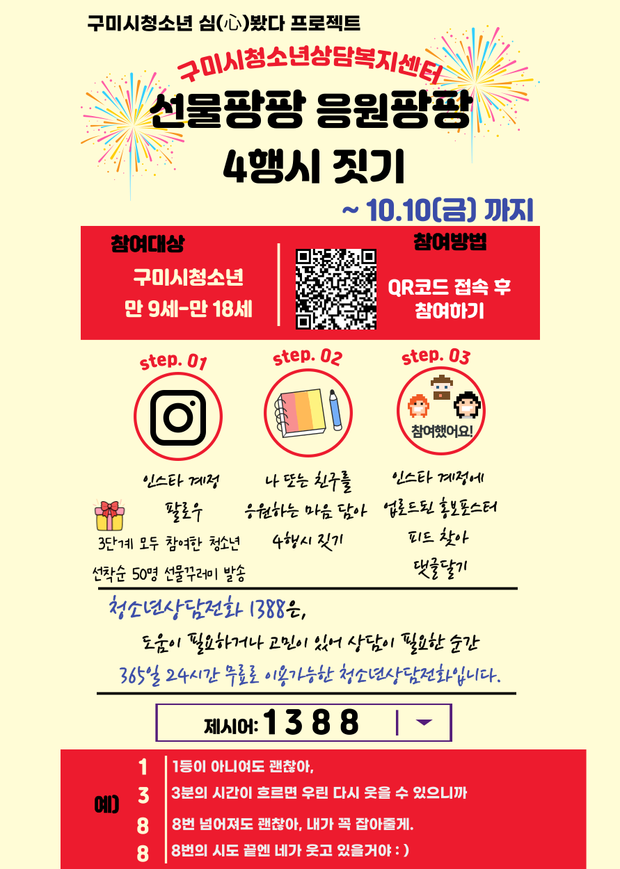 💡±¸¹Ì½Ãû¼Ò³â»ó´ãº¹Áö¼¾ÅÍ¿¡¼ ±¸¹Ì½Ãû¼Ò³â ½É(ãý)ºÃ´Ù ÇÁ·ÎÁ§Æ®ÀÇ ÀÏȯÀ¸·Î ¼±¹°ÆÎÆÎ ÀÀ¿øÆÎÆÎ 4Çà½Ã Áþ±â ÇÁ·Î±×·¥À» ½Ç½ÃÇÕ´Ï´Ù~💡