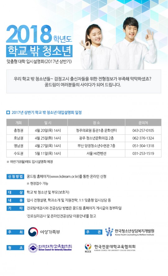 ±¸¹Ì½Ã¿¡ °ÅÁÖÇÏ´Â Çб³ ¹Û û¼Ò³âµéÀÇ ÇзÂÃëµæ Áö¿øÀ» À§ÇØ ²Þµå¸² û¼Ò³âµé°ú ÇÔ²² ´ëÇÐÀԽü³¸íȸ¿¡ Âü¼®ÇÏ·Á°í ÇÕ´Ï´Ù.